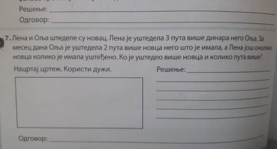 - Lena i Olja štedele su novac. Lena je uštedela tri puta više dinara nego Olja. Za mesec dana Olja je uštedela tri puta više novca nego što je imala, a Lena još onoliko novca koliko je imala uštedeno. Ko je uštedeo više novca i koliko puta više? - piše je u zadatku.