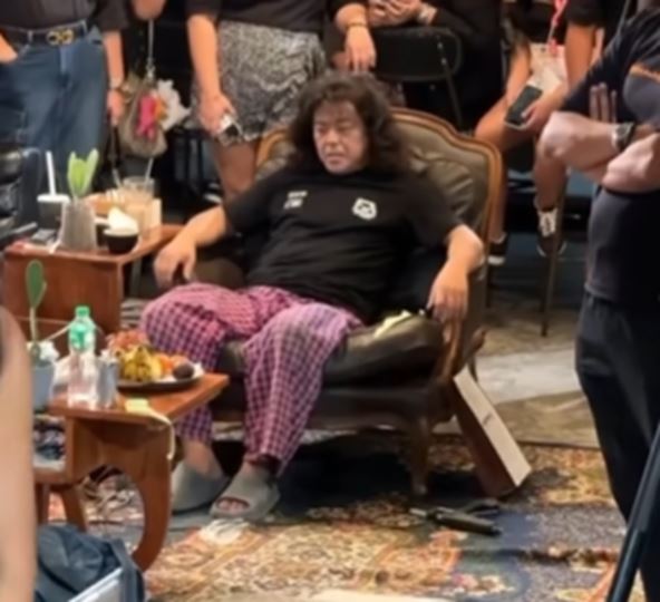 Dok sedi u fotelji iz osamdesetih, oko njega su cigarete, kafa i alkohol. Ispod njegovih nogu u kućnim papučama nalazi se tepih sličan Pirotskom ćilimu, a on obučen u pidžamu.