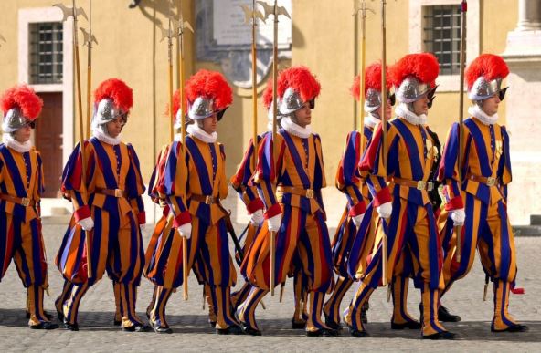 Švajcarska garda, zadužena za papinu bezbednost, ima ulogu bezbednosne snage u Apostolskoj palati i Vatikanu. Njeni članovi nose prugaste uniforme u kombinaciji plave, crvene i tamno žute boje. Da biste postali švajcarski gardista, uslov je da budete muškarac katoličke veroispovesti, visok najmanje 1.75 metara, koji je odlužio najmanje dve godine švajcarske vojske.