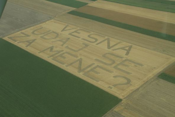 "Kada sam sve završio, iz aviona sam snimio kako to izgleda – sa nekih 300 metara, pošto se sa zemlje ne vidi. Kada sam se popeo na traktor mogao sam da vidim jedno slovo, eventualno dva, ostala su bila kao linije. Nisam znao kako je ispalo. Zato smo dan pre prosidbe sve snimili iz aviona", kaže Mario.