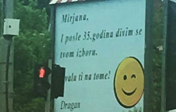 Hladno i kišovito vreme, kao i loše raspoloženje Beograđanadefinitivno je popravio jedan Dragan, koji je odlučio da preko bilborda na Banovom Brdu iznenadi suprugu Mirjanu nakon 35 godina ljubavi.