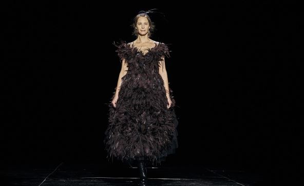 Na reviji koja je najavila njen povratak u svet modelinga, ponela je raskošnu crnu koktel haljinu prekrivenu perjem, crne kožne čizme i crni fascinator.