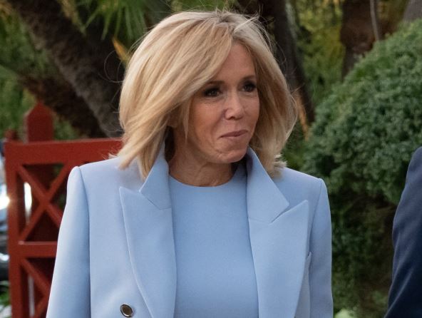Brižit Makron je goste dočekala u elegantnom izdanju svetlo plave boje. Prva dama Francuske je odabrala haljinu dužine iznad kolena i odgovarajući kaput sa dva reda kopčanja.