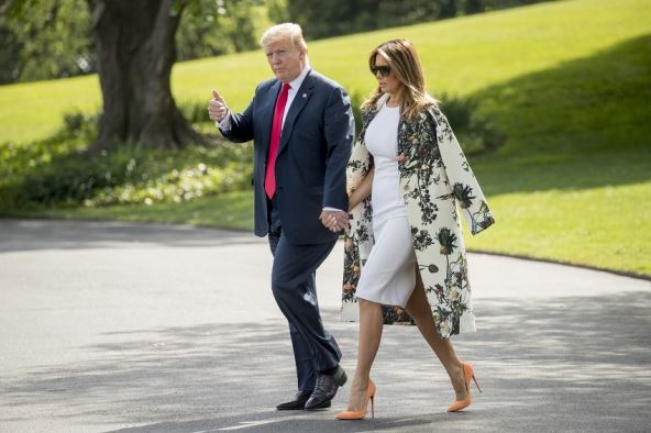 Melanija je odlučila da na njihovo omiljeno mesto otputuje u top prolećnoj odevnoj kombinaciji, pa je ponela čisto belu haljinu do kolena, preko koje je u svom stilu "prebacila" predivan prolećni cvetni mantil.