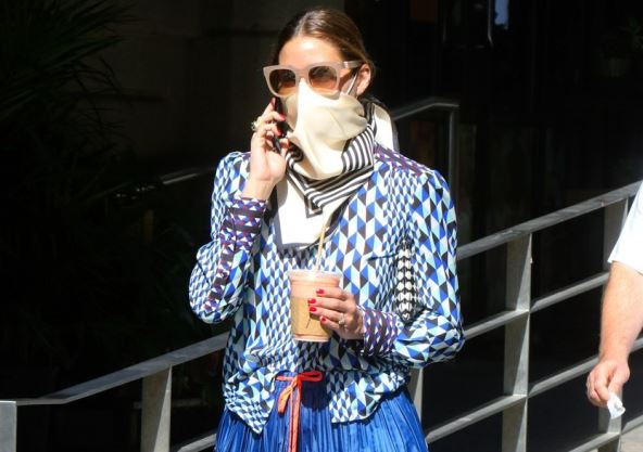 U drugoj kombinaciji, Olivija nosi svilenu midi suknju u boji rđe, i žuti končani džemper sa otkrivenim ramenima. Modna ikona je umesto maske na lice stavila svilenu maramu efektnog dezena.