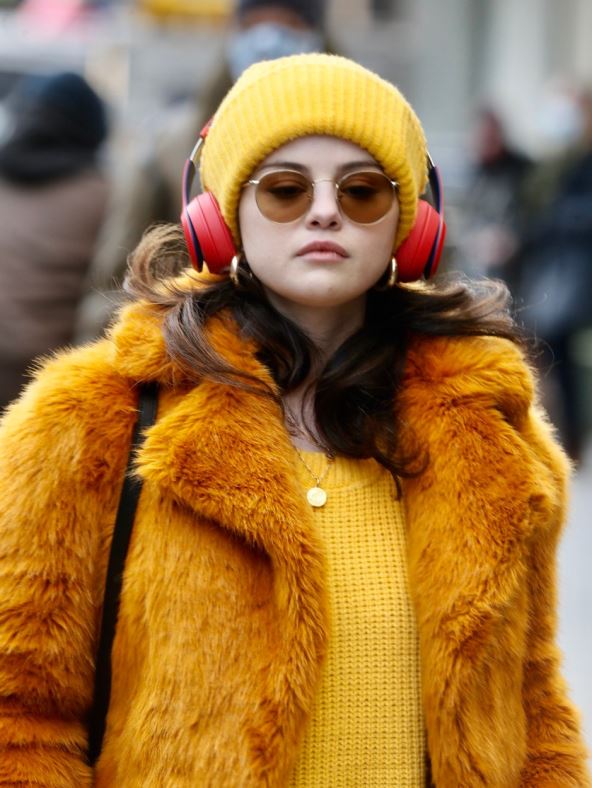 Mlada pevačica se obukla u skladu sa vremenskim uslovima: toplo i udobno, a opet urbano i seksi. Noseći žuti džemper i žutu kapu, slušalice, narandžastu bundu i smeđe, karirane pantalone, Selena se obukla savšeno moderno.