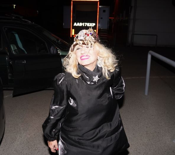 Izgleda da joj je ideja bila kombinacija crne i srebrne! Tako je obukla crnu svetulucavu tuniku, crne helanke, srebrno crne cipele, a na glavi je imala crni kačket ukrašen srebrnim trakama i nitima. Na ušima je imala velike srebrne, viseće naušnice, dok je nosila i naočare specijalno ukrašene dijamantima i šljokicama.