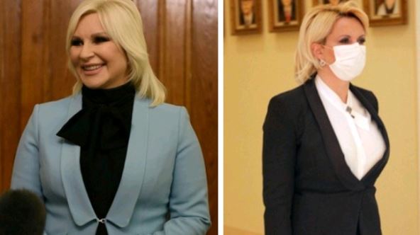 Pošto su dve ministarke stajale jedna pored druge, nismo mogli a da ne primetimo da su skoro identično obučene: crna uska suknja do kolena, strukiran sako sa naramenicama i bluza.