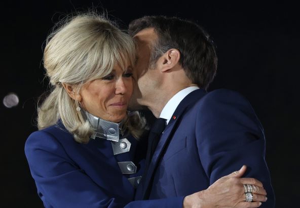 Na proslavi trijumfa društvo mu je pravila supruga Brižit, koja je bila sjajno raspoložena, a potrudila se da se i stilski uskladi sa Makronom.