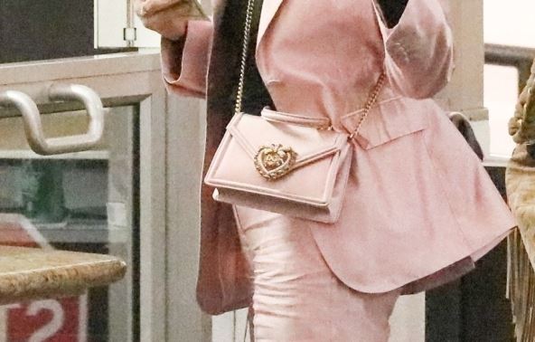 Roze odelo – strukiran blejzer i pantalone uskog kroja i podvrnutih nogavica, uklopila je sa crnom rolkom i crnim mokasinama, dok je detaljima u vidu roze torbe i naočara za sunce sa ombre efektom zaokružila stajling.