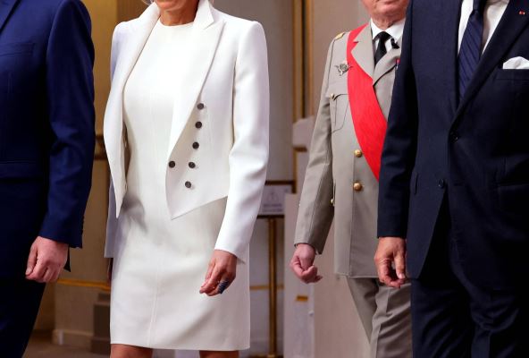 Prva dama Francuske se za ovu važnu priliku opredelila za jednostavnu, svedenu, ali veoma moćnu kombinaciju u beloj boji koja se lako izdvajala u masi, s obzirom da je većina prisutnih uglavnom izabrala tamne boje.