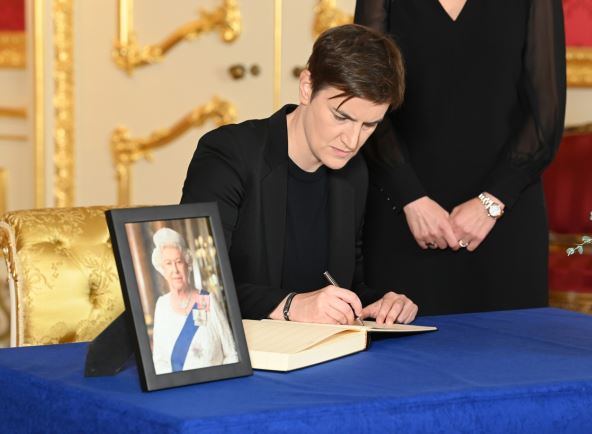 Među njima se našla i predsednica Vlade Srbije, Ana Brnabić koja je u nedelju otišla u London, te se tom prilikom upisala u knjigu žalosti povodom kraljičine smrti, u Lankasterskoj kući.