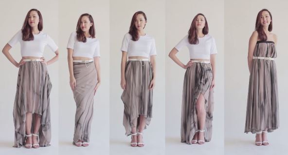 Za samo nekoliko sekundi možete da transformišete dugačku široku suknju u kraću, asimetričnu ili usku varijantu. A možete i da joj dodate volumen ili da je nosite kao haljinu uz neki efektni kaiš