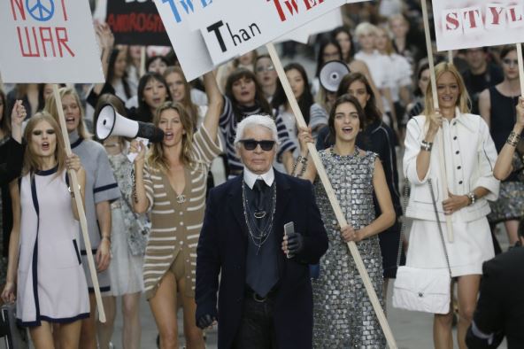 Kako moda na ulici mora biti svesna okruženja i svih socijalnih pojava, kulminacija revije bile su demonstracije predvođene Lagerfildom. Devojke su osim njegovih modela nosile i transparente sa jakim porukama savremene žene: Budi drugačija, Istorija je njena priča (History is her story), Pravite modu ne ratove, ali i Muškarci bi takođe trebalo da budu trudni.