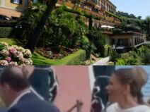Na intimnoj ceremoniji pojavila se u pompeznoj venčanici od kombinacije delikatne, prozirne tkanine sa tufnicama i bogato ukrašene čipke sa trodimenzionalnim cvetovima. Veo je doprineo dramatičnom efektu jer je i sam bio ukrašen istim cvetnim ukrasima.