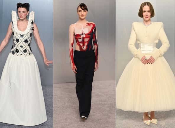 Neprepoznatljiva je bila engleska manekenka Kara Delevinj (33) koja je stigla u bodiju dugih rukava ukrašenom crvenim, crnim i belim šljokicama koje podsećaju na muški torzo. Izgled je upotpunila crnom olovka suknjom i kosu je podigla u elegantnu frizuru.