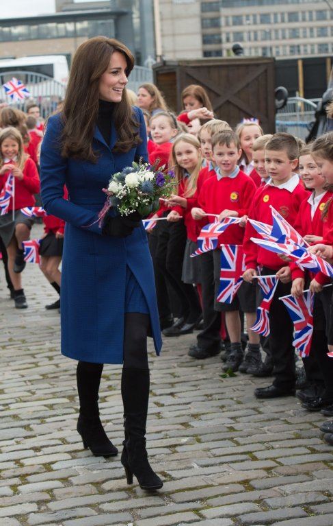 Dugi kraljevsko plavi kaput je savršeno stajao vojvotkinji koja je ispod njega nosila crnu roklu, crne hulahopke, crne čizme i plavu suknju.