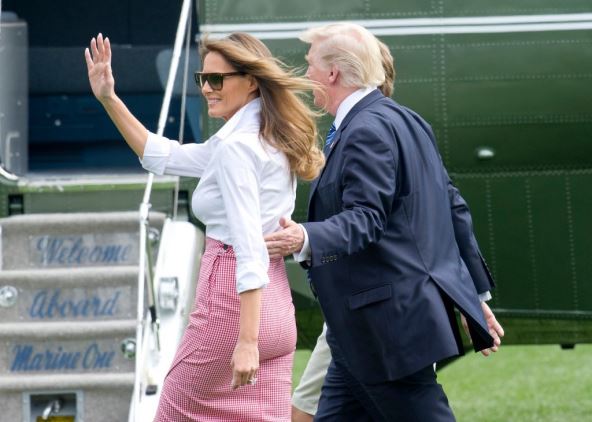 Donald, Melanija i njihov sin Baron otputovali su iz Vašingtona helikopterom koji ih je sačekao na travnjaku, a prva dama Sjedinjenih Američkih Država ponovo je bila u centru pažnje. Ona je za ovu priliku ponela običnu košulju bele boje, koja je obavezan komad u svakoj sezoni, a posebno tokom leta.