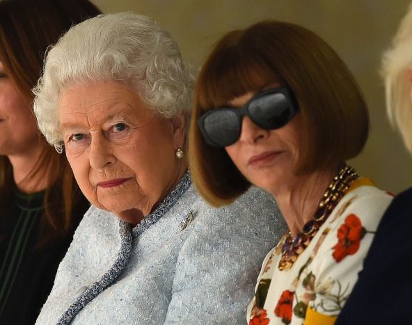 Ovo je bio prvi put da se 91-godišnja britanska kraljica pojavila na londonskoj Nedelji mode, a društvo joj je u prvom redu pravila slavna modna urednica Ana Vintur koju ni kraljevska pojava nije sprečila u nošenju sunčanih naočara, njenog zaštitnog znaka.