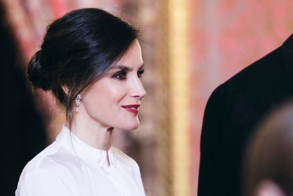 Uz prigodnu šminku u znaku crvenog ruža i nemarnu punđu, svoje novo formalno izdanje španska kraljica kompletirala je neutalnim dijamantnim naušnicama.