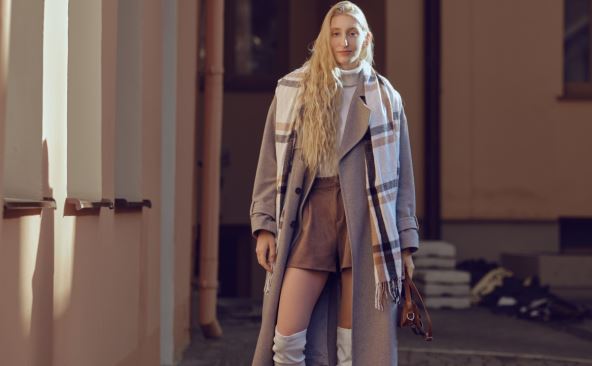 Ova kombinacija stvara balans između ženstvenog i ležernog. Rolka unosi toplinu, dok šorts i visoke čizme naglašavaju noge.
