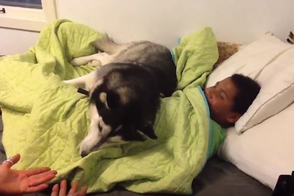 Ovaj mladi haski se udubno namestio uz svog vlasnika i nije mu dozvoljavao da ustane da se sprema za školu. Kada bi njegova mama pokušala da ga otkrije, haski bi vratio prekrivač nazad preko dečaka.