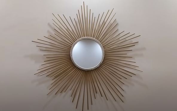 Da biste napravili unikatno ogledalo u obliku sunca, trebaće vam sledeće: parče jačeg kartona, okruglo ogledalo (može neko staro koje je ispalo iz okvira), duži štapići za ražnjiće, lepak, boja u spreju, plastična imitacija biserne ogrlice.