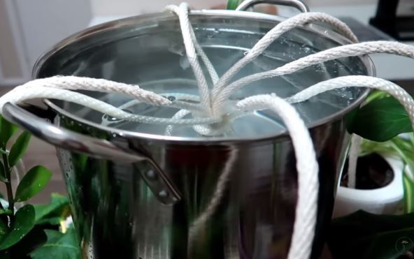 Ideja je da deblji kanap isečete na onoliko delova koliko saksija hoćete da navodnjavate. Šerbu napunite sa dovoljlno vode. Kanape vežite na jednom kraju, da dibijete čvor, koji ćete potom umočiti u šerpu.