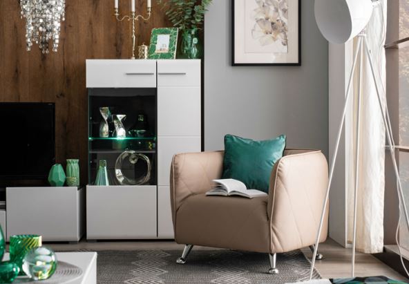 Pravi primer minimalističkog nameštaja je vitrina ENZO u dekoru opak bele boje, crnog drveta i bele lak folije, koja zajedno sa foteljom BARSELONA u bež štofu čini idealan spoj za ambijent dnevnog boravka. Ukoliko u ovakvom ambijentu želite da dodate toplinu drvo dekora sa određenom dozom rustičnosti, možete to učiniti tapetom u drvo dekoru na fokusnom zidu, koji se najčešće nalazi iza TV police. Uvođenjem ove tapete postiže se dodatna toplina ambijenta.