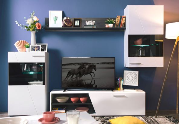Regal LENS, koji čine TV polica, vitrina i zidna polica, u kombinaciji bele lak folije i crnog drveta, sa poluzastakljenim elementima, daće domu potpuno novi sjaj i futuristički izgled. Regal se može dodatno opremiti i LED rasvetom, za bolji izgled ambijenta.