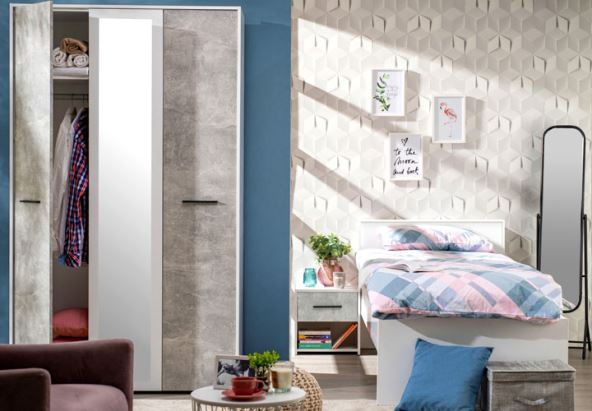 Nameštaj dizajniran u kombinaciji belog i beton dekora predstavlja idealnu kombinaciju za sve ljubitelje monohromatskog stila ili hladnijih tonova. Detalj za isticanje su crne ručice, koje uz beton dekor čine enterijer ovakve sobe upotpunjenim i elementima industrijskog stila, jednog od popularnijih kod mlađe populacije.