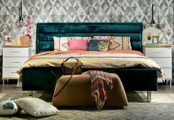Kontrast možete primeniti i kombinovanjem različitih materijala. U spavaćoj sobi možete kombinovati zid i krevet u istom tonu, a da paterni na njima naglašavaju i dočaravaju njihovu raskošnost. Tapeta na zidu odlično doprinosi izgledu ambijenta. Francuski ležaj LOZANA u tamnozelenom štofu dodatno raskošnim čini tapacirani ram, a uz njega bi se savršeno uklopio roze tabure TRAPEZ, kojim biste kompletirali priču o kontrastu.