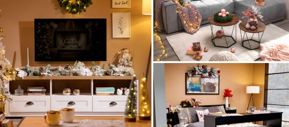 TV policu, poput TV police PROWANSJA možete dekorisati bogatim girlandama zajedno sa figurama Deda Mraza i novogodišnjih kugli u staklenoj posudi. Iznad televizora okačite novogodišnji venčić ukrašen NG LED lampicama, a na klub sto dodajte još dekoracije, poput patuljka i ukrasnih jelki sa lampionima.