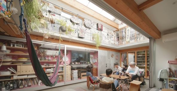 Smešten u četvrti Suginami u Tokiju, dom mnogih manga umetnika, kuća sa ovorenim krovom je dom umetnika i arhitekte Zajirogha, njegove supruge i njihovo troje dece. Zajirogh je dizajnirao veliko centralno dvorište na otvorenom i pokrio ga čaršavom nalik na jedro na uvlačenje. Porodica koristi dvorište kao dnevni boravak koji je opremljen kamperskim nameštajem koji se po potrebi može pokvasiti ili brzo premestiti.