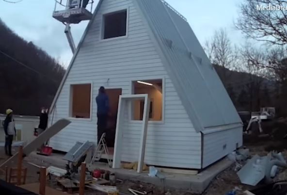 U videu možete videti ubrzan prikaz gradnje modernog doma koji se u trenutku pretvara u konačni proizvod, zajedno s prozorima i vratima.