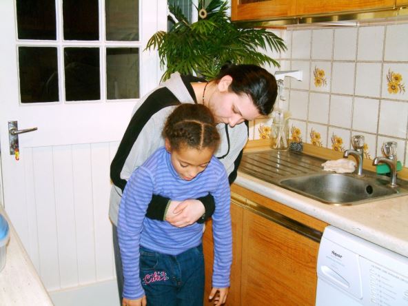 • Uzimite dete sa obe ruke i obmotajte ih oko njegovog grudnog koša, tako da ga blago savijete na napred i vršite pritisak pritiskajući snažno i popuštajući - naizmenično. Taj zahvat takođe može pomoći da dete samo izbaci strano telo i dušnika.