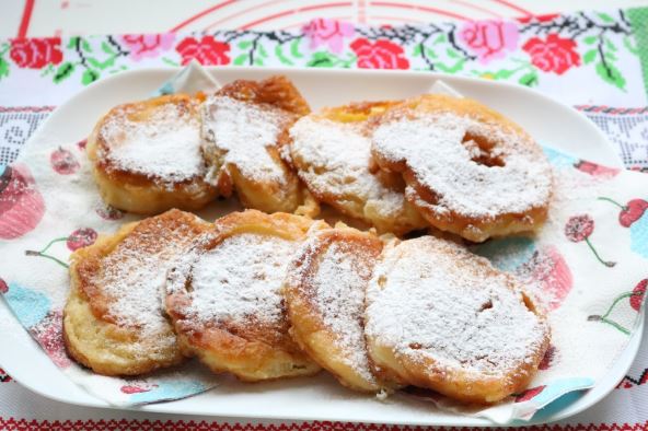 Priprema: Zamesiti testo kao za palačinke samo malo gušće. Jabuke očistiti i iseći na listiće. Ubaciti u testo i pržiti u ulju.