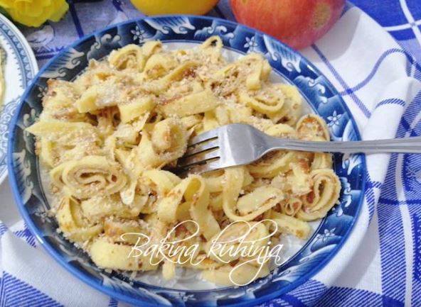 Uzeti makaze ili nož i iseći palačinke na rezance. Rezance posuti šećerom i seckanim orasima.