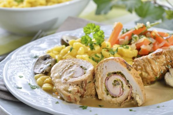 Belo meso iseći na šnicle i blago izlupati tučkom. Svaku šniclu namazati senfom i posuti suvim začinom. Preko mesa staviti šnit patlidžana, i po širini štapić slanine i kačkavalja. Uviti u rolnu i čačkalicom pričvrstiti, pa pržiti na vrelom ulju da meso malo porumeni.
