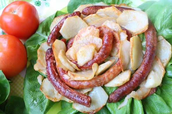 Priprema: Krompir očistiti i iseći na listiće posoliti, malo dodati aleve paprike i ulja. Tepsiju premazati uljem kobasicu staviti u sredinu, a između poređati krompir. Kobasice probosti drvenim štapićem i peči na 200 stepeni C oko 40 minuta. Uživajte u sjajnom ukusu. Prijatno!!!