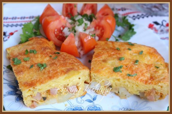 - Krompir očistite i isecite na kocke, dodajte ulje, začin ili so, alevu papriku, može i mleveni biber, beli luk i šunku na kocke.