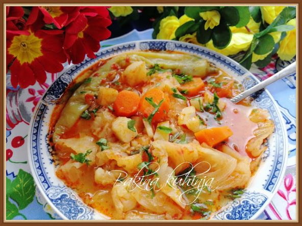 - Na isečen kupus dodajte mlad luk, ubacite zelenu papriku, šargarepu isečenu na kolutove, celer, peršun, krompir, i 3-4 čena belog luka.