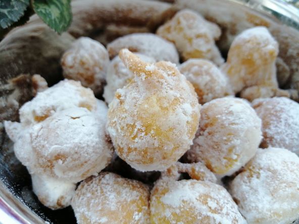 Potrebni sastojci: 2 jaja, 150 gr brašna, 1 kašičica praška za pecivo, malo sode bikarbone, 1 kašike ulja za testo, 2 kašike šećera, 100 mlmleka, ulje za prženje, prah šećer, 1 vanilin šećer.