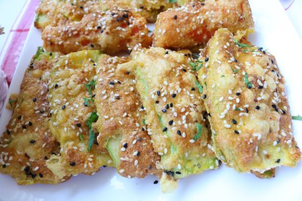 Priprema: Tikvice iseći na tanke listove i posoliti. Ostaviti 15-20 minuta da odstoji pa iscediti tečnost. Jaja umutiti u činiji. U posebnu činiju sipati prezle, brašno, griz, pola susama i začinske paprike. Sve izmešati.