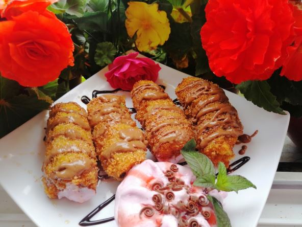 Banane uvaljati u brašno u jaja i kokos. Pržiti u vrućem dubokom ulju dok ne porumene. Vaditi na salvete. Banane preliti u tankim mlazu medom i rastopljenom čokoladom. Servirati uz kuglu sladoleda.