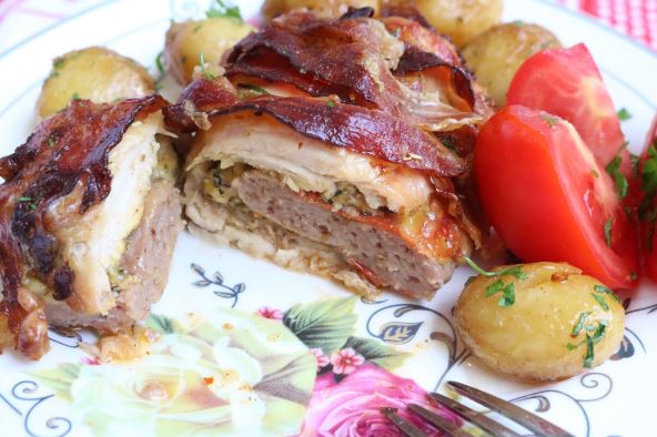 Pokriti drugom polovinom mesa pa uviti suvom slaninicom.