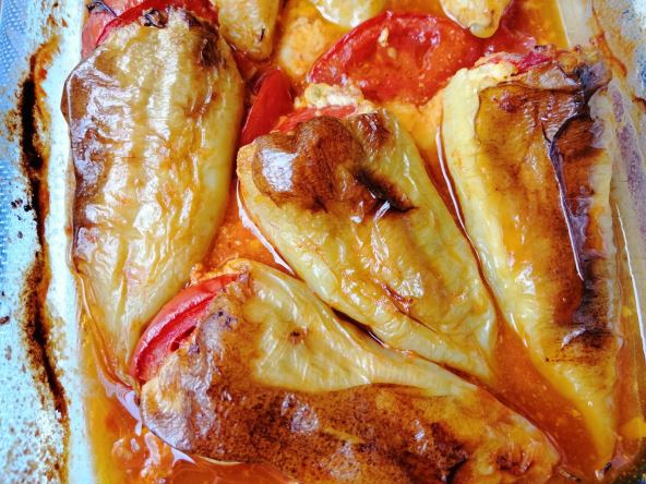 Sve izjednačiti, puniti paprike i zatvoriti kolutovima paradajza.