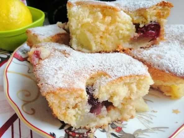 Potrebno je: 100 gr griza; 150 gr brašna; 5 jaja; 200 ml jogurta ili kiselo mleka; korica limuna; 1 prašak za pecivio; 2 vanilin šećera; 100 ml ulja; 100 gr šećera; 400 gr dinja; 200 gr višanja.