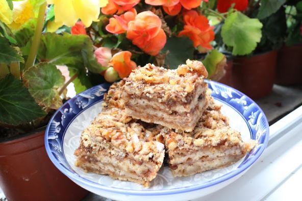 Završiti sa tanjim slojem brašna pritisnuti rukama pa na brašno narendati maslac i posuti seckane orahe. Peći na 200 stepeni C oko 45 min.