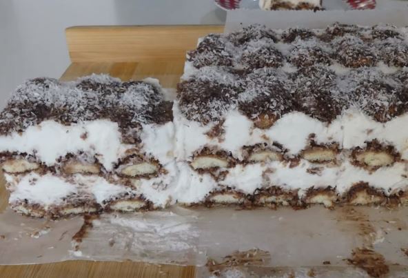 Sastojci: 200 g piškota, 300 ml mleka, 100 g crne čokolade za kuvanje, 100 g putera, 1 puna kašika kakao praha, 500 ml mleka, 1 puding od kokosa ili vanile, 80 g šećera, 6 listova želatina, 300 ml slatke pavlake, 200 g kokosa.